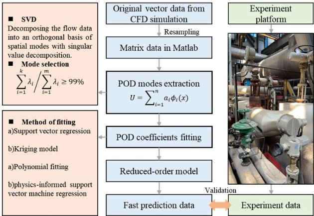 The results show that, compared with CFD simulation, ROM has increased the computational efficiency by more than four orders of magnitude. The maximum error of the ROM result is 13.59%. The ROM predicts the distribution of pressure, temperature and entropy, with a relative root mean square error (RRMSE) of less than 2%. This work proposes a new reduced-order modeling framework for predicting the distribution of physical quantities within pressure reducing valves.